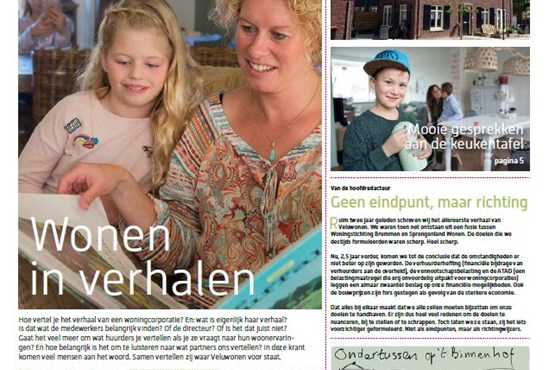 Hoe vertel je het verhaal van een woningcorporatie? En: wat is eigenlijk haar verhaal? Is dat wat de medewerkers belangrijk vinden? Of de directeur? Of is het dat juist niet? Gaat het veel meer om wat huurders je vertellen als je ze vraagt naar hun woonervaringen? En hoe belangrijk is het om te luisteren naar wat partners ons vertellen? In deze krant komen veel mensen aan het woord. Samen vertellen zij waar Veluwonen voor staat.